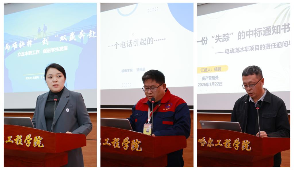 会上,教务处高爱利以《从“两难抉择”到“双赢奔赴”》为题、机电学院逯恒良以《一个电话引起的……》为题、资产管理处杨鹏以《一份“失踪”的中标通知书》为题、机电学院高鹏以《一个座位引发的逆袭》为题、齐工产教集团隽永刚以《“角色”引发的变化》为题、土木与管理学院袁继杰以《从“忐忑应战”到“收获认可”的蜕变》为题、艺术与体育学院姜岩以《微专业“破冰记”》为题,分享了精彩的案例故事。